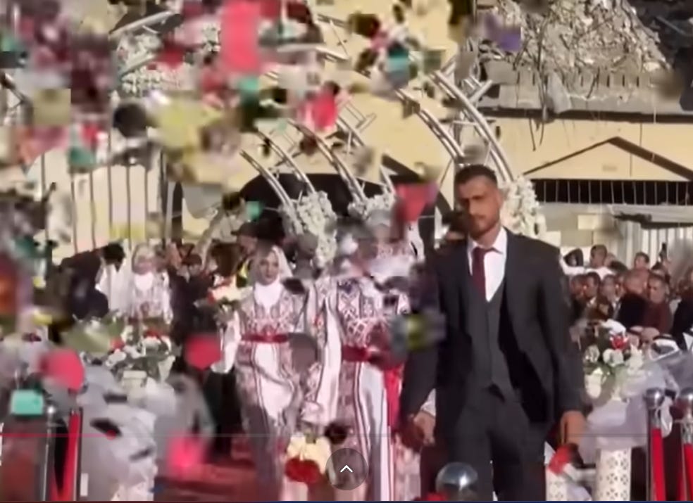 People in Khan Younis took a break from the daily funerals to celebrate the joint wedding of 54 couples in deliberate defiance of the ongoing genocide.